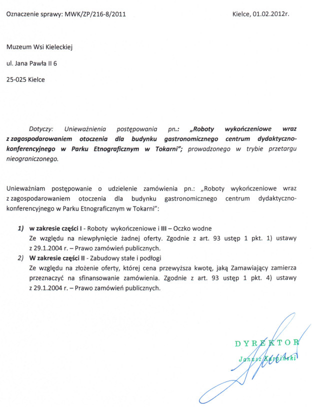 Przetarg nieograniczony na: Roboty wykończeniowe wraz z zagospodarowaniem otoczenia dla budynku gastronomicznego centrum dydaktyczno-konferencyjnego w Parku Etnograficznym w Tokarni (unieważniony)