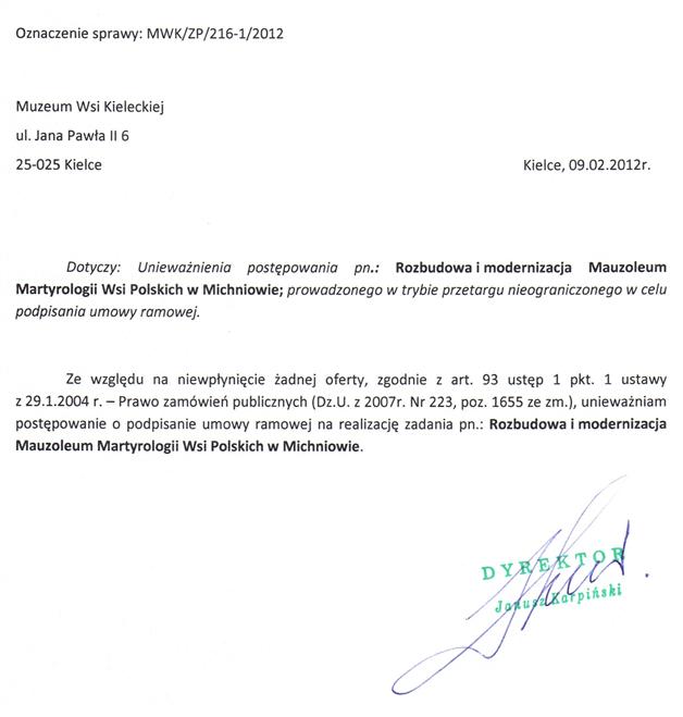 Unieważnienie postępowania pn.: Rozbudowa i modernizacja Mauzoleum Martyrologii Wsi Polskich w Michniowie